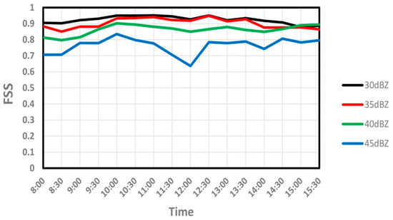 It can be seen in Figure 1, the convective regions show great consistency between the simulations and the observations in terms of both coverage and placement. The simulation accuracy of the stratiform regions is slightly worse than that of the convective regions. The quantitative evaluation results indicate the same results, which the FSSs are greater than 0.75 for convective regions during the simulation period (Figure 2, an FSS value of >0.5 serves as a good indicator of a useful forecast [34,38]).