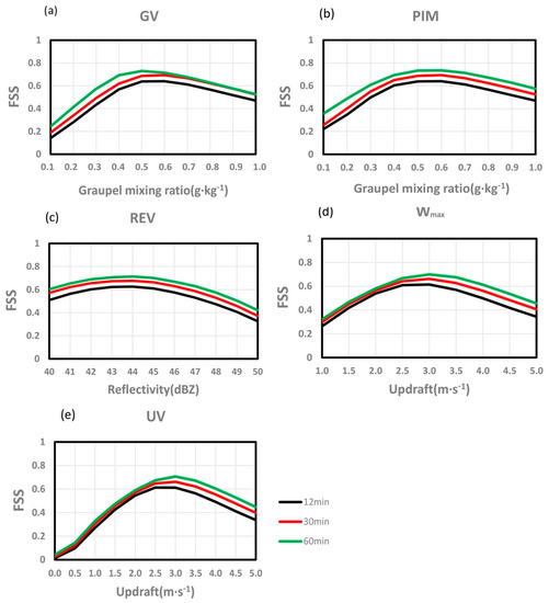 Since these five storm parameters are physically related (e.g., graupel volume are related to maximum updrafts), it is not surprised that there will not be much difference between the FSSs of these proxies. However, there was still a difference between the FSSs of these proxies. It can be seen in Figure 6, the FSS for different proxies ranged from 0.70 to 0.73 for the thresholds of 1 flash 9 km−2 h−1, ranged from 0.54 to 0.59 for the thresholds of 5 flash 9 km−2 h−1, ranged from 0.46 to 0.52 for the thresholds of 10 flash 9 km−2 h−1, ranged from 0.33 to 0.45 for the thresholds of 15 flash 9 km−2 h−1 and ranged from 0.23 to 0.39 for the thresholds of 20 flash 9 km−2 h−1, respectively.