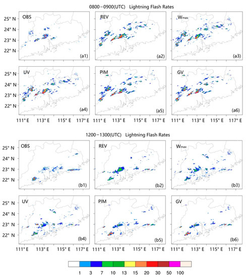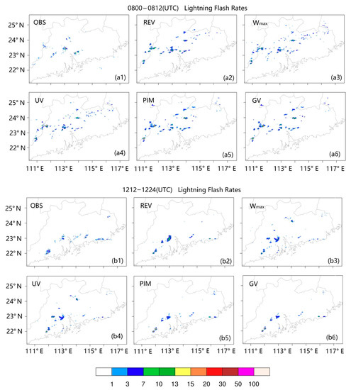 As in Figure 4, but accumulated over two 60 min periods. (a1,b1) are from the observations, and (a2–a6), (b2–b6) are from the different lightning diagnostic schemes with different proxies. The abbreviations of each lightning diagnostic scheme are labeled in each panel.