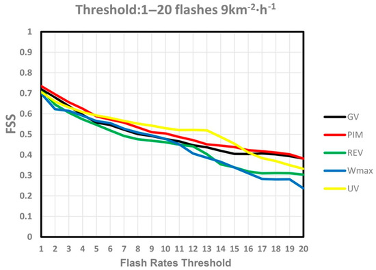 By comparing the FSS statistics for different lightning flash rate thresholds (Figure 6), it can be found that the FSS values were decreasing as lightning flash rate thresholds increased for all the lightning diagnostic schemes with different proxies. FSS statistics with a threshold of 1 flash 9 km−2 h−1 suggest lightning diagnostic schemes are useful to indicate general tendencies for the occurrence, region, and time of lightning flash (FSS statistics for the threshold of 1 flash 9 km−2 h−1 were around 0.7 for each scheme). As mentioned in [34,38,39], a FSS value of >0.5 serves as a good indicator of a useful forecast when the probability that a particular grid point has an event (e.g., precipitation or lightning) is small (the probabilities are less than 0.0336, 0.0213, 0.0136 for 60-min, 30-min, and 12-min accumulated lightning flash rates, respectively, in the observations and simulations of this study). For thresholds from 1 to 3 and 16 to 20 flashes per 9 km2 per hour, the graupel contents related schemes (GV and PIM) achieved slightly higher FSS values compared with the other three schemes. For thresholds from 5 to 15 flashes per 9 km per hour the updraft volume related scheme (UV) yielded the largest FSS. For the threshold greater than 13 flashes per 9 km2 per hour, the FSS values were below 0.5 for all the lightning diagnostic schemes.