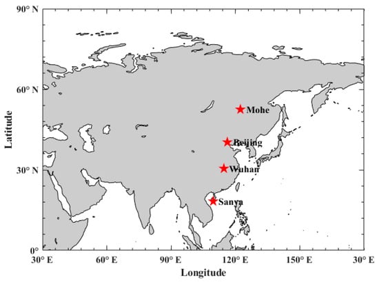 Geographical distribution of Mohe, Beijing, Wuhan, and Sanya meteor radar stations.