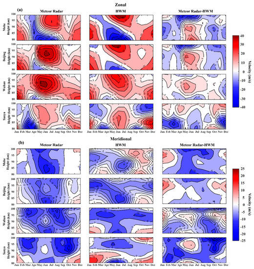 Although HWM can provide reference wind field with high spatiotemporal resolution at MLT region, some studies indicate that there are great discrepancies between the model results and observations. Hibbins et al. detected large differences between wind fields measured by Falkland Islands SuperDARN radar (52° S, 59° W) and HWM07-predicted model winds for diurnal, semidiurnal, and terdiurnal tides at southern middle latitudes []. HWM07 is one of the Horizontal Wind Model series. Day et al. compared model results of HWM07 with zonal and meridional winds in MLT region measured by a meteor radar at Bear Lake Observatory (42° N, 111° W) []. Their results demonstrate that the model-calculated zonal wind in winter is 2 times stronger than the radar-measured zonal wind below 85 km height. Su et al. analyzed horizontal winds and tides in MLT region from the data measured by Chung-Li (24.9° N, 121° E), Taiwan meteor radar []. Comparison between the meteor radar winds and HWM07 results show that the amplitudes of the mean wind, diurnal, and semidiurnal tides of the radar-measured winds in 82–100 km height are larger than those of the model-calculated winds by up to a factor of 3.