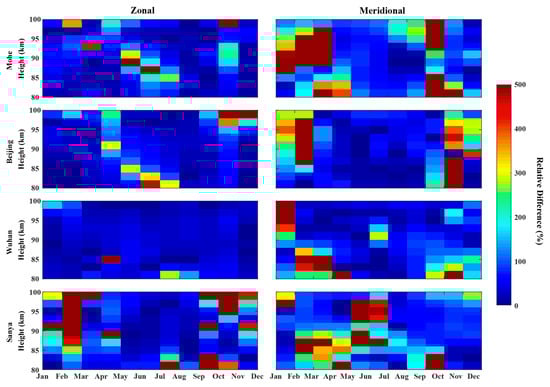 Figure 3 present the relative difference between meteor radar observed and HWM14 predicted zonal (the left column) and meridional (the right column) wind. Compared to zonal wind, the meridional component shows larger discrepancies between observations and model predictions.