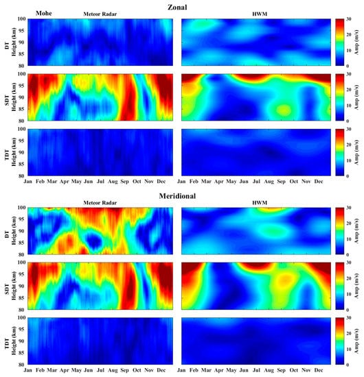 Diurnal (DT), semidiurnal (SDT), terdiurnal (TDT) tidal amplitude obtained from Mohe meteor radar measurements (left column) and HWM14 (right column).