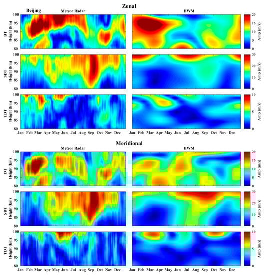 Diurnal (DT), semidiurnal (SDT), and terdiurnal (TDT) tidal amplitude obtained from Beijing meteor radar measurements (left column) and HWM14 (right column).
