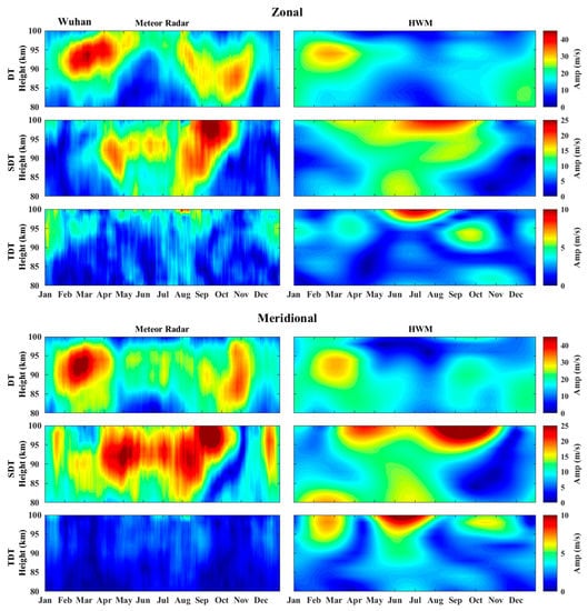Diurnal (DT), semidiurnal (SDT), terdiurnal (TDT) tidal amplitude obtained from Wuhan meteor radar measurements (left column) and HWM14 (right column).