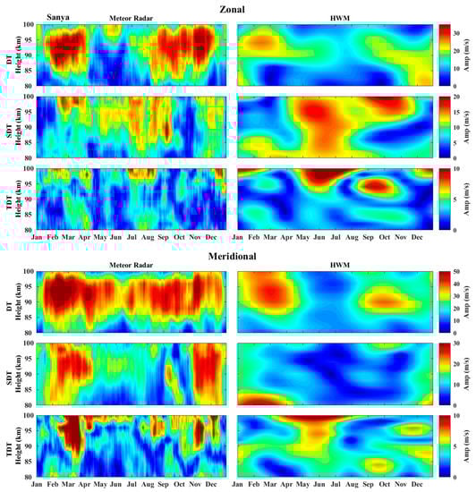 Diurnal (DT), semidiurnal (SDT), and terdiurnal (TDT) tidal amplitude obtained from Sanya meteor radar measurements (left column) and HWM14 (right column).