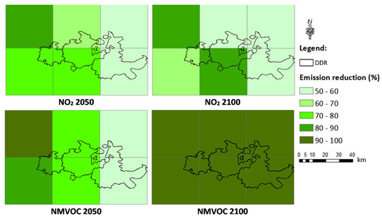 Spatial distribution of NO2 and NMVOC emissions reduction (%) for the DDR EMEP cells in 2050 and 2100.