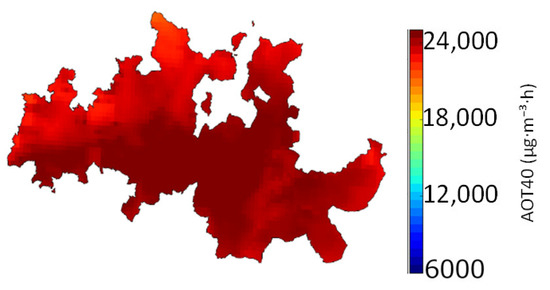 In these Soja et al. [41] equations, AOT40 is expressed in µmol·mol−1·h. For this work, the function applied was the one calculated for the last year of the experiment, meaning that this exposure–response function assumed that grapevines were exposed to constant levels of ozone for three years.