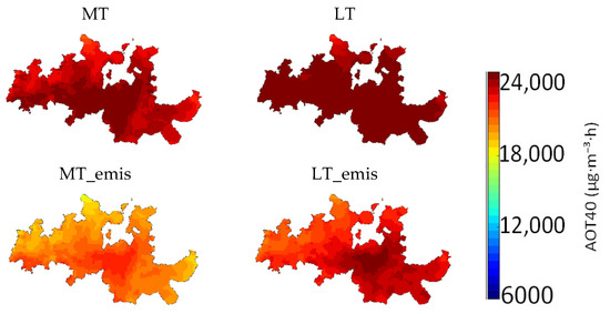 For the MT scenario, no relevant differences were estimated in relation to the BASE scenario, with an average reduction of 1% in AOT40 levels, due to the small changes in meteorological conditions. On the other hand, AOT40 levels decreased by 20% in the MT_emis scenario, indicating that the reduction in AOT40 levels was mainly influenced by the reduction in emissions.