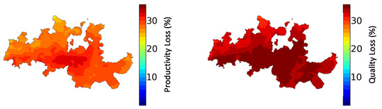 In the BASE scenario, the exposure to high AOT40 levels led to an average productivity loss of 27% and a quality loss of 32%, following Soja et al. [41] response functions. The spatial distribution was similar to that in the AOT40 maps since this indicator was the only variable in the exposure–response functions. These results show that the quality indicator was more sensitive to O3 exposure when compared to productivity; O3 decreased the photosynthetic capacity of leaves and shifted the partitioning of available carbohydrates [41].