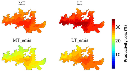 Productivity Loss (%) for mid-term and long-term climate change scenarios in the DDR (1 × 1 km2 horizontal resolution). Legend: MT—Mid-term simulation; MT_emis—Mid-term simulation with projected emissions; LT—Long-term simulation; LT_emis—Long-term simulation with projected emissions.