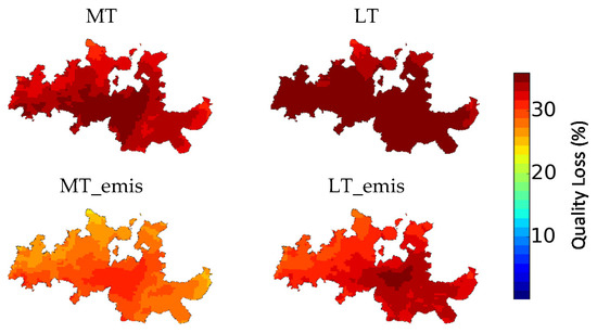 Quality loss (%) for mid-term and long-term climate change scenarios in the DDR (1 × 1 km2 horizontal resolution). Legend: MT—Mid-term simulation; MT_emis—Mid-term simulation with projected emissions; LT—Long-term simulation; LT_emis—Long-term simulation with projected emissions.