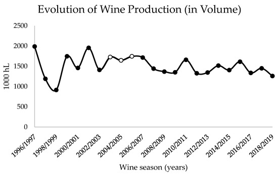 Evolution of wine production in the Douro wine region from 1996 to 2018, according to Instituto da Vinha e do Vinho, I.P annual reports [48]. The study period (2004 to 2005) is highlighted in white.