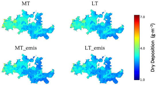 O3 dry deposition (g·m−2) results for mid-term and long-term future climates. Legend: MT—Mid-term simulation; MT_emis—Mid-term simulation with projected emissions; LT—Long-term simulation; LT_emis—Long-term simulation with projected emissions.