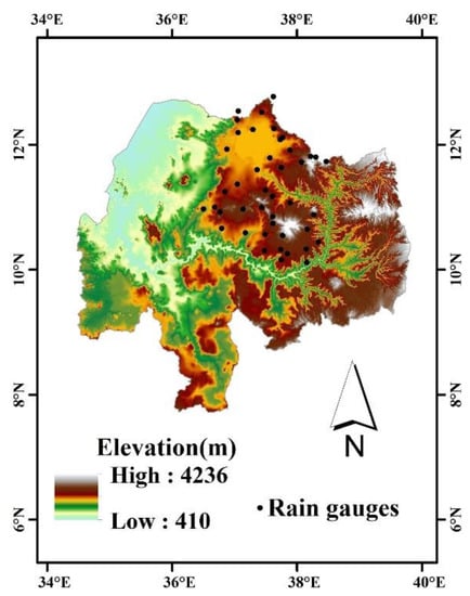Map of the elevation of the Upper Blue Nile Region (reprinted with permission from []). Black dots indicate the locations of rain gauge measurement.