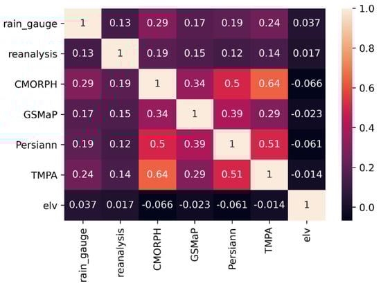 In our study, 53,098 samples of rainfalls were collected, but only the cases where the measured rainfall value was greater than zero were used. The median rainfall was 8.6 mm/day for the rain gauges, with a standard deviation of 9.92 mm/day. Medians and standard deviations for the different models are given in Table 2. The reanalysis data had the closest median and standard deviation (6.94 and 7.91 mm/day, respectively) compared to the rain gauge measurements (8.6, 9.92 mm/day respectively). GSMaP had the lowest median value (2.54 mm/day). Another parameter was the elevation at which the precipitation was measured. The correlation matrix using the Pearson correlation coefficients (Equation (1)) between variables with respect to rain gauge is shown in Figure 2. CMORPH showed a higher correlation (0.29), followed by TMPA (0.24). Elevation had the lowest correlation (0.037).