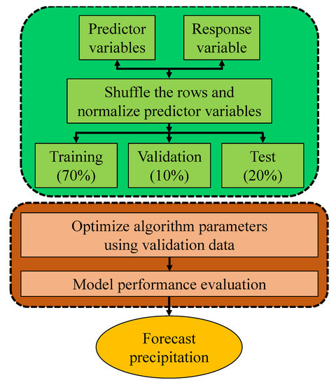 The workflow is shown in Figure 3. In our study, elevation and five precipitation products (‘Reanalysis’, ‘CMORPH’, ‘GSMaP’, ‘PERSIANN’, ‘TMPA’) were used as input features/predictor variables. The input data were normalized using min-max scaling (Equation (2), the resultant data are scaled between 0 and 1). This ensured that every feature had equal significance during training.