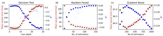 Optimization of the decision tree regressor (a), random forest regressor (b), gradient boosting regressor (c) algorithms. Unit for mean square error is (mm/day)2.
