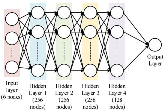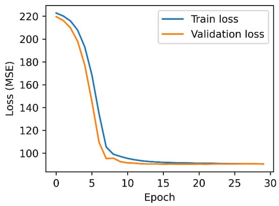 Neural networks are machine learning algorithms comprised of an input layer, one or more hidden layers, and an output layer []. Each layer has multiple nodes, with each node generally connected to the input features or outputs from an earlier layer. The output of each node is the weighted sum of inputs to that node. The sum is then fed to an activation function. We used a fully connected NN (every node in a layer is connected to every node in the following layer) with four hidden layers (Figure 5). The input layer consisted of the five input models (CMORPH, PERSIANN, TMPA, GSMaP, and reanalysis) and elevation. The hidden layers contained 256, 256, 256, and 128 nodes, respectively, with rectified linear unit (relu) as their activation function. The output layer predicting precipitation had one node without any activation function. A batch size of 3000 was used. Early stopping was used to prevent overfitting to the training data. The loss versus epoch plots for the training and validation datasets are shown in Figure 6.
