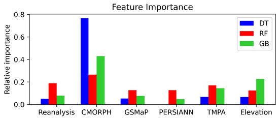 The importance (scale of 0 to 1) of different features for all machine learning algorithms apart from NN are shown in Figure 7. Feature importance is a feature’s contribution to node impurity. CMORPH is most important feature for all algorithms but its weight changes for different algorithms. For examples, it has a relative importance of 0.76 for decision trees but 0.27 for Random Forest. PERSIANN appears to be the feature with the lowest importance overall. This is probably caused by GSMap and PERSIANN reporting zero precipitation for at least up to 25th percentile.