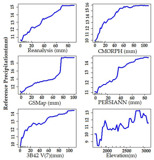 To further demonstrate potential insights into the influence of individual variables on the response variable, a Partial Dependence Plot (PDP) was created for the study area (Figure 8). PDP presents the impact of each variable on the output variable while other variables remain constant []. The PDP plot in our study shows the response variable (reference precipitation) responding to all the inputs used in this study. This suggests that the variables selected in our study have a considerable impact on the precipitation prediction, justifying our choice to include them.