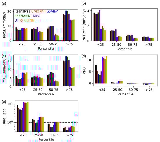 Percentile-based comparison of RMSE (a), NCRMSE (b), MAE (c), MRD (d), and BR (e) between input models and different machine learning algorithms on the test dataset. Total number of samples in test set was 10,620; thus, each of the four percentile ranges contain 2655 samples. The 0th, 25th, 50th, 75th, and 100th percentile values are 0.03, 3.8, 8.5, 15.2, and 124 mm/day, respectively. The preferred value for BR (=1) is indicated by a black dashed line.