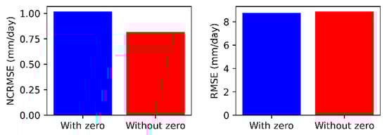 NCRMSE and RMSE for test datasets with (blue) and without (red) zero precipitation included.