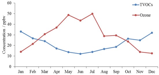 Monthly variation of concentrations for total VOCs and ozone in Shenyang.