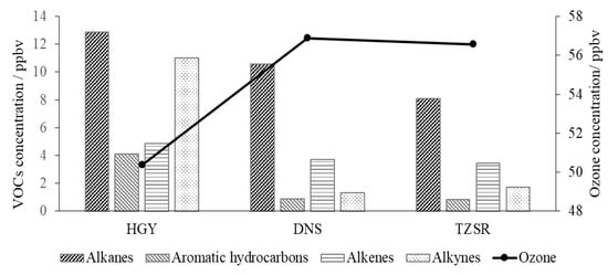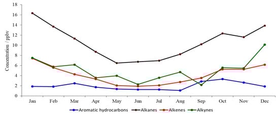 In Shenyang, the total concentration of the 52 types of VOCs (TVOC) from high to low appears in winter, autumn, spring, and summer, whereas the concentration of ozone from high to low appears in summer, spring, autumn, and winter. The TVOC reaches a maximum in January, with a value of a little more than 33 ppbv, and reaches a minimum in June. The concentration of ozone reaches a maximum in May and July, with a value of near 50 ppbv in July, and a minimum in December (Figure 2). For various types of VOCs, the concentrations of alkanes, alkenes, and alkynes generally appear highest in winter and lowest in summer, but the concentrations of aromatic hydrocarbons were highest in autumn and lowest in summer. Alkanes appear with the highest concentration, followed by alkynes, alkenes, and aromatic hydrocarbons (Figure 3). In general, seasonal variations of VOC concentrations are mainly influenced by three factors, namely, the variations of VOC source strength, the various degrees of photochemical reaction due to the seasonal levels of hydroxyl radical and the variations of the atmospheric mixing state. The higher values of TVOC and its components in autumn and winter over Shenyang are mainly due to the large amount of emission of primary pollutants from heating in autumn and winter, which directly or indirectly influences the source strength of VOCs. In addition, the atmospheric photochemical reaction is hardly active enough to remove VOCs due to the lower temperatures in autumn and winter. Moreover, the relatively stable atmospheric and temperature inversion at night are not conducive to the diffusion and dilution of pollutants [31]. The fact that aromatic hydrocarbons appear higher in autumn than in winter was also found in the study of Baoji, Shanxi, with the process here related to the combustion emissions of petrochemical, pharmaceutical, pesticide, paint, and other industries and fossil fuels [32].