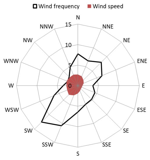 For the three VOC environmental monitoring sites in Shenyang, the annual mean VOC concentrations from high to low appear at HGY, DNS, and TZSR, whereas the annual mean ozone concentration from high to low appears at DNS, TZSR (with the same level as DNS), and HGY. The concentration of each VOC component is the highest in HGY, which is located in an industrial area, whereas the concentration of ozone is lower than those at DNS and TZSR, which are located to its east and northeast (Figure 4). The reason is that the dominant wind direction in Shenyang is southwesterly on average throughout the year, while the wind speed is over 3 m/s, which is faster than those of other directions (Figure 5). Driven by the dominant wind, ozone formed locally and VOCs at the site located in the upwind direction (e.g., HGY) are transported to the east and northeast, with the further formation of ozone due to photochemical reaction during this process [25]. Elevated ozone then appears in the downwind direction (e.g., at DNS and TZSR sites).