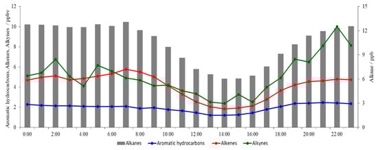 Diurnal variations in each type of VOC show rather similar bimodal patterns, with the peaks mainly appearing in the morning and evening. Alkanes and alkenes reach their maximum at 7:00 (Beijing time, the same below), whereas alkyne and aromatic hydrocarbons reach their maximum at 22:00 and 21:00, respectively, which is basically consistent with the peak hours of traffic. The concentration of each type of VOC reaches a minimum in the afternoon (13:00–14:00) (Figure 6). In the morning rush hours, human activities, such as traffic and industry, become frequent, rapidly increasing the concentration of VOCs to reach the first peak. Then, with the gradual significance of solar radiation and turbulence, VOC levels keep decreasing until they reach a minimum in the afternoon. At night, the suspension of photochemical reactions due to solar radiation decreases, along with the accumulated contribution of the evening traffic peak, results in the second peak of VOCs. The concentration of each type of VOC is higher at night and lower in the daytime, which is significantly related to the lack of photochemical reaction consumption at night, and the lower atmospheric boundary layer height hardly being conducive to pollutant diffusion.