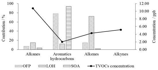 Figure 7 shows the chemical reactivities of various types of VOCs. Contributions to the formation potential of SOA from large to small are aromatic hydrocarbons (94%), alkanes (4%), and alkenes (2%). Despite the lower level of aromatic hydrocarbons compared with other types of VOCs, they play an absolutely dominant role in the contribution to the formation of SOA, which is demonstrated in the results of the northern suburbs of Nanjing [8,22], which show a similar percentage, indicating that the formation of SOA is significantly influenced by aromatic hydrocarbons. The dominant contributions of aromatic hydrocarbons to the formation potential of SOA appear in various seasons, with the percentage from high to low in autumn, spring, winter, and summer (Table 2).