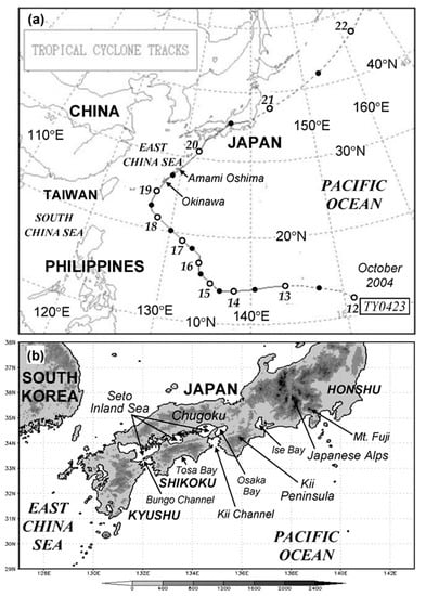 (a) The JMA’s best-track data of Typhoon Tokage (TY0423) in UTC during 12–22 October 2004 and (b) the focused area of western Japan in this study and its topography (m, gray shades), with various geographical features labelled. In (a), open (solid) circles depict the typhoon center at 0000 (1200) UTC of each day, and the solid track indicates the period when the storm reached TC intensity (32.7 m s−1).