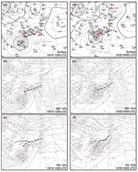 JMA weather maps at (a) surface, (b) 850 hPa, and (c) 700 hPa at 1200 UTC 19 October 2004. Variables analyzed are mean sea-level pressure (MSLP; hPa, isobars every 4 hPa) and fronts in (a), and geopotential height (gpm, solid, every 30 gpm), temperature (°C, dashed, every 3 °C), and wet areas with dew-point depression ≤ 3 °C (dotted patches) in (b,c). Upper-level troughs/ wind-shift lines near Japan are plotted (thick dashed lines), and the wind-shift line at 500 hPa is also marked (thick dotted line) in (c). (d–f) These images show the same as (a–c), except at 0000 UTC 20 October 2004.