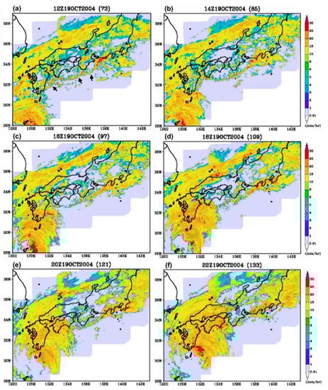 The rainfall intensity (mm h−1) derived from the JMA radar reflectivity at 2-h intervals from at (a) 1200 to (f) 2200 UTC, 19 October 2004. The color scales are plotted to the right. The arc-shaped rainbands are marked by arrows in (a).