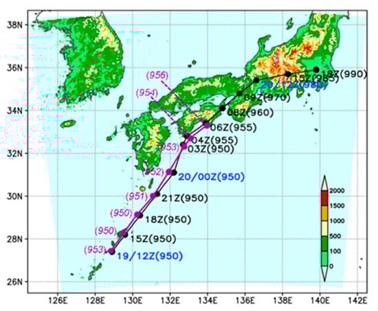 The domain (light-blue shaded area) and topography (m, shading, scale inserted) in the CReSS model, the JMA best-track data of TY0423 every 3 h over the simulation period of 19–20 October 2004 (black line with solid dots, date labelled and in blue every 12 h), and the simulated track at the same times until 0600 UTC 20 Oct (purple line with dots). Numbers in the parentheses give the estimated central MSLP (hPa) of TY0423 in the best-track data and model simulation.