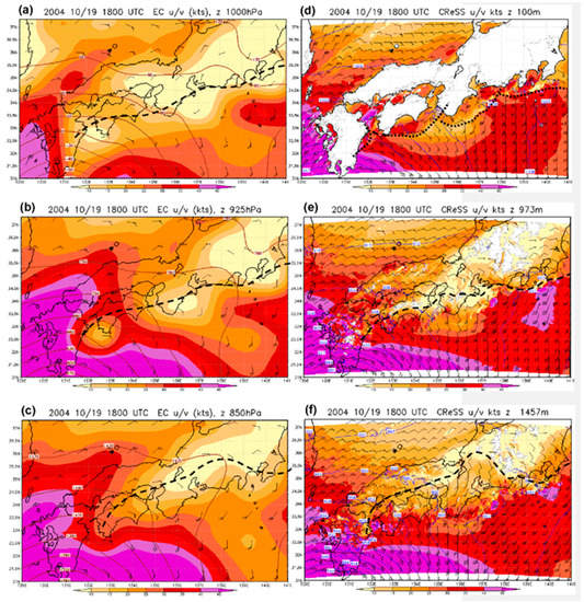 The JMA surface weather map at 1200 UTC 19 October 2004 shows that TY Tokage was southwest of Japan, as mentioned, with a central mean sea-level pressure (MSLP) of 950 hPa (Figure 2a). At this time, the subtropical Pacific High (STPH) controlled the region east and southeast of Japan, while a mid-latitude low (near 49° N, 135° E) was traveling east toward Sakhalin Island, followed by another high near 120° E. The western/central Japan was thus situated at the southern part of a saddle field, with northeasterly flow over much of the region. This northeasterly flow encountered the southerly flow east of the TC near the shorelines of Kyushu, Shikoku, and southern Honshu, where a synoptic-scale stationary front formed with an ENE–WSW orientation (Figure 1b and Figure 2a). A similar flow configuration surrounding Japan existed at 850 hPa, where the wind-shift line appeared about 150 km north of the surface front (Figure 2b). In particular, note that the winds on either side of the wind-shift line were very strong, reaching 30–40 kts ahead and 30 kts behind as well. Further up at 700 hPa, the position of the wind-shift line was another 200 km to the north and near the northern shorelines of western Japan; and southerly flows were found over much of western–central Japan at 1200 UTC 19 October (Figure 2c). When Typhoon Tokage moved closer (and the southerly flow associated with the TC got stronger) 12 h later, the synoptic flow patterns remained but the front/low-level wind-shift line was pushed back by a distance roughly 50–150 km (Figure 2d–f). Note that the northeasterly flow behind the wind-shift line further intensified during this period and could reach a speed as high as 70 kts at 850 hPa at 0000 UTC 20 October (Figure 2e). At 700 hPa, wind speeds near South Korea also picked up significantly, from 5–15 kts to 25-45 kts (Figure 2f), clearly linked to the approach of TY Tokage to the region. At 500 hPa (charts not shown), a wind-shift line between the southerly flow (associated with TC and STPH) and the mid-latitude westerlies also existed during this period, but was further west compared to the 700 hPa one (cf. Figure 2c,f).