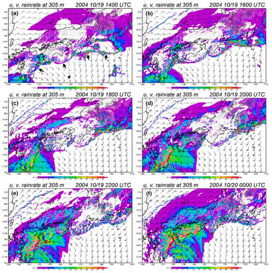 The model-simulated wind fields at 305 m and rainfall rates over the period of 1400–2400 UTC 19 October are shown in Figure 6 and can be compared with Figure 3 and Figure 5. In Figure 6, the gradual enhancement of the near-surface southerly flow upstream from the Japanese isles with time is well-captured, as confirmed through a comparison with ECMWF analyses during our case period (not shown). About one hour into the simulation (near 1300 UTC, not shown), a series of three to four arc-shaped rainbands developed just south of the Japanese isles, about 50–100 km upstream from Kyushu, Shikoku, and southern Honshu, and become well-defined before 1400 UTC (Figure 6a). During the following hours, the location, orientation, structure, and evolution of these rainbands with time in the model (Figure 6) are highly realistic and in close agreement with radar observations (Figure 3). While these rainbands are undoubtedly collocated with the narrow convergence zones near the surface, as discussed earlier (Figure 5d and Figure 6c), the model clearly well-captures the phenomenon of the collapse and retreat of the rainbands back over land (Figure 6). The retreat takes place around 1800 UTC for the one east of Kyushu, prior to 2000 UTC for the one south of Shikoku, and near 2100 UTC for the one upstream of Kii Peninsula in the model (Figure 6b–f), also highly consistent with Figure 3. Except for the arc-shaped rainbands, the rainfall distributions near the TC, off the northern shores of Japan, and over Chugoku (cf. Figure 1b) are all simulated quite well (Figure 6). In particular, note also that the narrow rainbands over the Japan Sea during 1400–2400 UTC in the model are observed as well (Figure 3 and Figure 6).