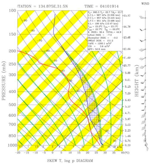 - Yoshizaki, M.; Kato, T.; Tanaka, Y.; Takayama, H.; Shoji, Y.; Seko, H.; Arao, K.; Manabe, K.; Members of X-Baiu-98 Observation. Analytical and numerical study of the 26 June 1998 orographic rainband observed in western Kyushu, Japan. J. Meteor. Soc. Jpn. 2000, 78, 835–856. [Google Scholar] [CrossRef]
