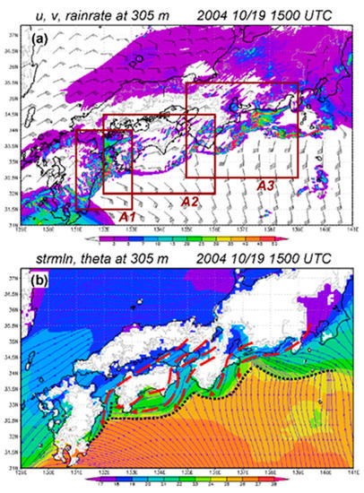(a) The model simulation rainfall rate as in Figure 6 but at 1500 UTC 19 October 2004. The three areas (used in Figure 9) are depicted (brown boxes) and labeled as A1 to A3. (b) The model simulated streamlines and potential temperature (θ, in K, shaded) at 305 m (height contours drawn as thin gray lines) at 1500 UTC 19 October 2004. The positions of rainbands are marked by thick, dotted, black lines, and several streamlines on the cold side are highlighted by thick, dashed, scarlet lines with arrows.