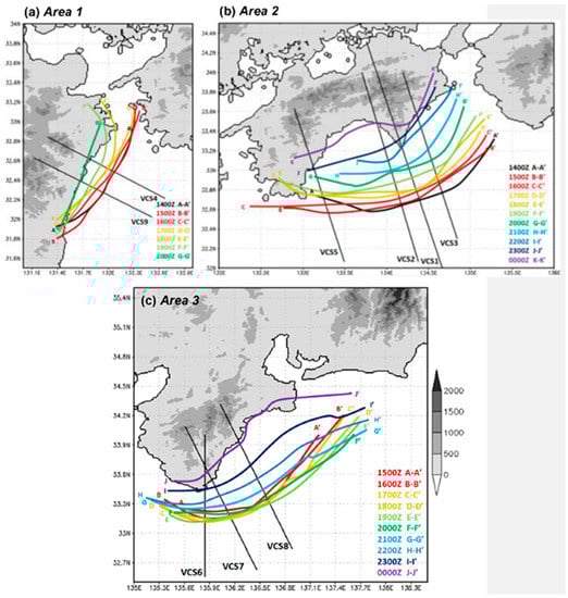 The temporal evolutions of the rainbands in the three areas are shown in Figure 9, which also depicts the locations of the VCSs constructed in this study, labeled as VCS1 through VCS9. The VCSs were selected to be roughly perpendicular to the rainbands. Using Figure 9, the three arc-shaped rainbands are traced through time (at 1-h intervals), and their behavior along each VCS is classified into three phases: standing (stationary or nearly so), retreating, and retreating back to land, as summarized in Table 2. Here, the standing phase is defined as the period when the rainbands remain stationary or nearly so. When the rainbands exhibit distinctly faster backward movement, it is defined as the retreating period, either over the ocean or back to over land. For the rainband upstream from Kyushu (in A1, Figure 9a), its southern segment apparently retreats earlier than the northern part. For the one upstream of Shikoku (in A2, Figure 9b), the retreat occurs around 1800–1900 UTC, but seems slightly earlier in the central segment than near the two ends. For the third rainband south of Kii Peninsula (in A3, Figure 9c), the retreat appears to occur concurrently along much of its length and shortly after 2000 UTC. In Table 2, the characteristic terrain height (h0) for each rainband (or area) is also given, which is estimated using Figure 9b and used for the calculation of Fr to be presented shortly.