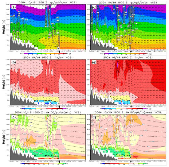 Three hours later at 1900 UTC (Figure 10d–f), the upstream flow (on the section plane) strengthened to about 19–23 m s−1 and Fr also increased to roughly 1.8–2.4 at 1–3 km, and the rainband started to retreat (cf. Figure 9b and Table 2). Nonetheless, N remained nearly unchanged (Figure 10f), similar to the finding of [] for Hawaii Island. Note also that at 1800 UTC a gap appeared in the rainband along its middle segment (near VCS1, cf. Figure 6c), and then the rainband started to retreat, apparently also faster in the middle part (cf. Figure 9b and Table 2). In Section 5.3, the possible linkages between the rainband gap and the retreat will be further discussed.