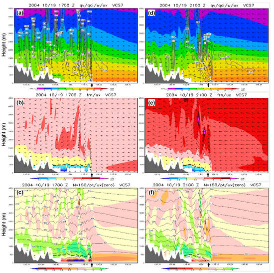 Model-simulated images as in Figure 10, except along VCS7 and at (a–c) 1700 and (d–f) 2100 UTC, 19 October 2004.