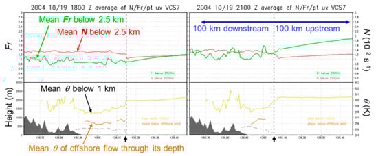 Several key parameters relevant to rainband behavior on the vertical cross-sections at low levels as shown in Figure 10 and Figure 11 can be averaged through appropriate depths (e.g., []), and the resulted distribution along the sections can be plotted and examined more easily, as shown for example in Figure 12 for VCS7. Values of Fr and N are averaged below 2.5 km to depict the mean properties in the upstream flow and their differences from those in the flow behind the rainband, while θ values are averaged below 1 km and also through the depth of the offshore flow only. At 1800 UTC, during the standing phase (Figure 12a), a time between those in Figure 11a–f, the mean N (of 0–2.5 km) was about 1.0–1.2 × 10−2 s−1 ahead of, but higher (about 1.3–1.4 × 10−2 s−1) and more stable behind the rainband. The mean Fr was about 0.9–1.2 upstream, and was comparable but much more variable downstream due to the stronger but more fluctuating wind components there (cf. Figure 11b,e). Corresponding to higher N values, the near-surface mean θ (of 0–1 km) was about 2 K colder behind than ahead of the rainband due to evaporative cooling effect, as discussed earlier, and the mean value in the offshore layer (≤500 m) was typically another 2–2.5 K colder (Figure 12a). At 2100 UTC during the retreating phase (Figure 12b, same time as Figure 11d–f), the upstream Fr increased significantly to about 1.4–1.9 but N changed little both upstream and downstream. Although the θ values below 1 km and in the offshore layer remained colder, the thermal contrast at the leading edge of the offshore flow, where it became very thin, was reduced (Figure 12b) as the rainband was pushed backward by the strengthening oncoming flow.