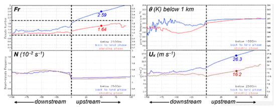 Mean values of Fr, N (10−2 s−1), and horizontal wind component parallel to section plane (Ux, m s−1) below 2.5 km and θ below 1 km, computed from 100 km downstream to 100 km upstream (abscissa, km) and averaged through time for all VCSs during the standing phase (red) and retreating back to land phase (blue) in A2. The rainband was placed at the origin of x-axis (dashed line), and Fr values of 1 and 2 (dashed) and Fr and Ux at 50 km upstream (dots) are marked.