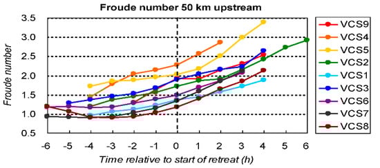 Temporal evolution of Fr (below 2.5 km) at 50 km upstream from the rainband on the nine VCSs (VCS1-VCS9), from 6 h before to 6 h after the beginning of retreat. The time of retreat commencement in all VCSs (cf. Table 2) is placed at the origin along the abscissa.