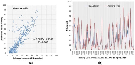 - The comparison between the Aether device measurements and the NOA fixed-site monitoring station’s corresponding measurements presents a coefficient of determination which ranges between 0.510 (O3) and 0.702 (NO2). This indicates a significant correlation between Aether and NOA measurements at a statistical significant level of p < 0.005.