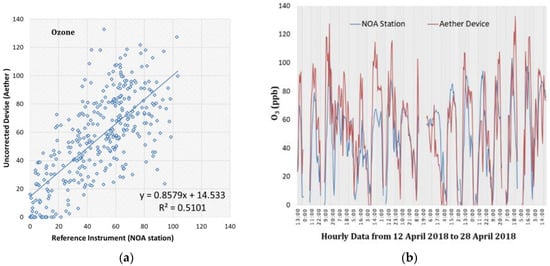 In Figure 3, the scatterplot and time series of ozone (O3) is provided with data completeness of 90.1%. The measurements range from 0 up to 62 ppb (122.0 μg/m3) according to NOA station and from 0 up to 89 ppb (175.0 μg/m3) according to the Aether device. The coefficient of determination is equal to R2 = 0.510, along with relatively high values of MAE and RMSE shows that there is a limited tolerable correlation between the measurements of the NOA station and Aether device. In this case, although R2 seems relatively low, with an adequate slope = 0.8579 and a positive intercept = 14.533, along with MBA = 7.78 ppb (15.5 μgr/m3) a rather important overestimation appears. According to the above, accurate data of local air quality, concerning O3, over long timescales should not be expected.