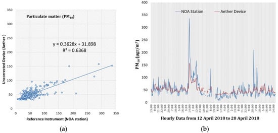 During the specific period, at least two major Sahara dust events occurred over Athens (Figure 4b) and in such cases dust can be a significant component of PM [47,48]. In these cases, it is clear that the Aether device could not adapt to these major fluctuations, along with relatively high values of MAE and RMSE. For both pollutants, a slight value of MBE < 0 indicates an underestimation of the real situation. It should be noted, however, that these sensors are also highly affected by humidity phenomena, therefore with the fluctuations low reliability was expected [49].